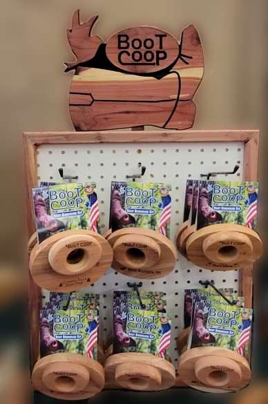 Our BOOT COOPtm is a fantastic product that benefits our feathery friends and repurposes those old boots in the closet. This ingenious little kit can turn any old boot into a functioning bird house. Made of eastern red cedar, with a proper size hole, and a predator guard for our small feathery friends. Kit includes instructions, fasteners, metal hanging loop. Name Drop Available. Print Minimums Apply but it can be combined with other products to meet the 72 Total Piece Print Minimum. Display Available Here